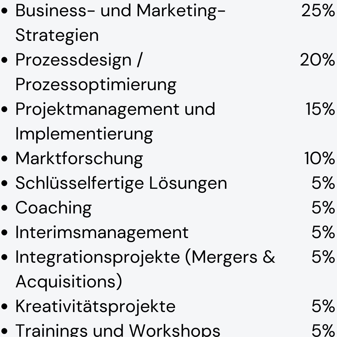 In den knapp 20 Jahren als Business-Consultant betreute ich rund 50 größere Consultingprojekte. Dazu kommen zahlreiche kleinere Projekte, Studien und Coachings von weniger als einem Monat Projektdauer. Dabei habe ich praktisch alle Industrien, alle Fachbereiche und alle Unternehmensherausforderungen aus intensiver eigener Anschauung kennengelernt. Neben den Consultingprojekten in Deuschland, die 40 Prozent meiner Consultingtätigkeit ausmachen, habe ich in 12 weiteren Ländern (auf 5 Kontinenten) Beratungsprojeke erfolgreich gemanagt.